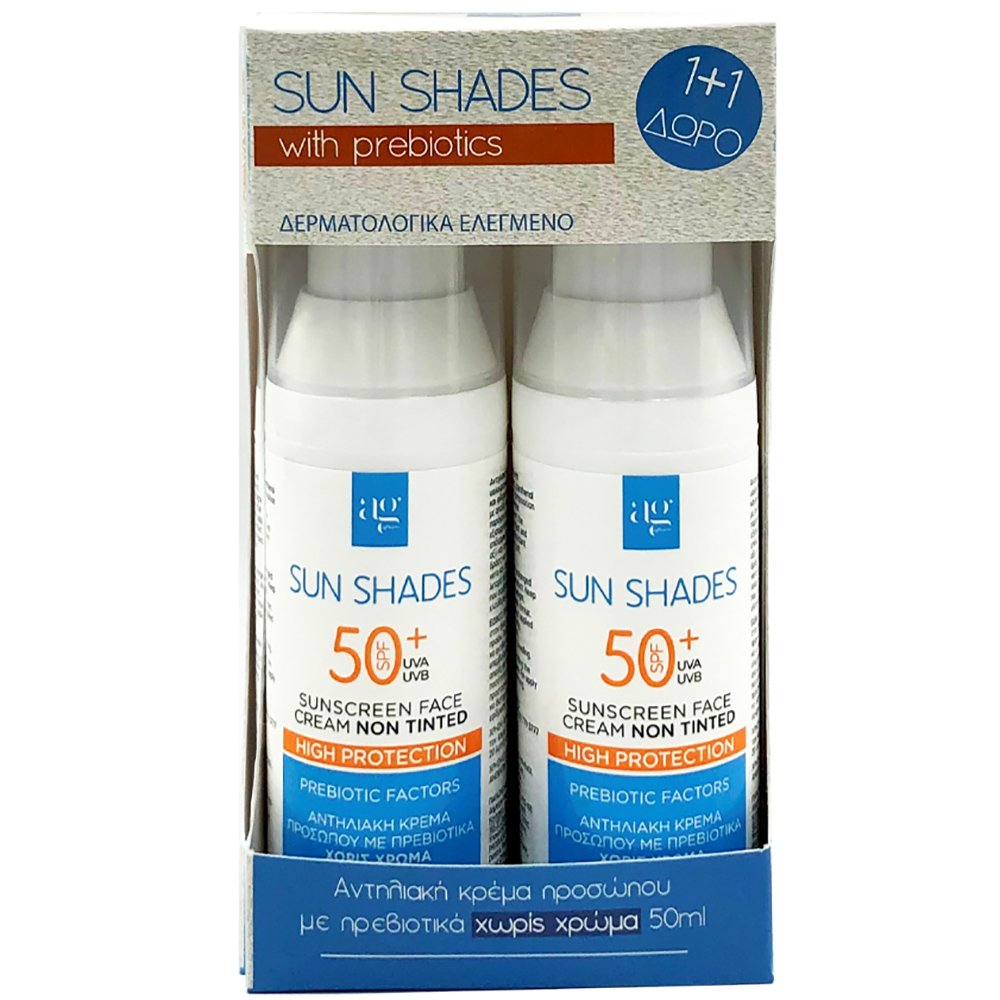Ag Pharm Πακέτο Προσφοράς Sun Shades Sunsreen Face Cream Non Tinted Spf50+ Αντηλιακή Κρέμα Προσώπου Πολύ Υψηλής Προστασίας με Πρεβιοτικά Χωρίς Χρώμα 2x50ml