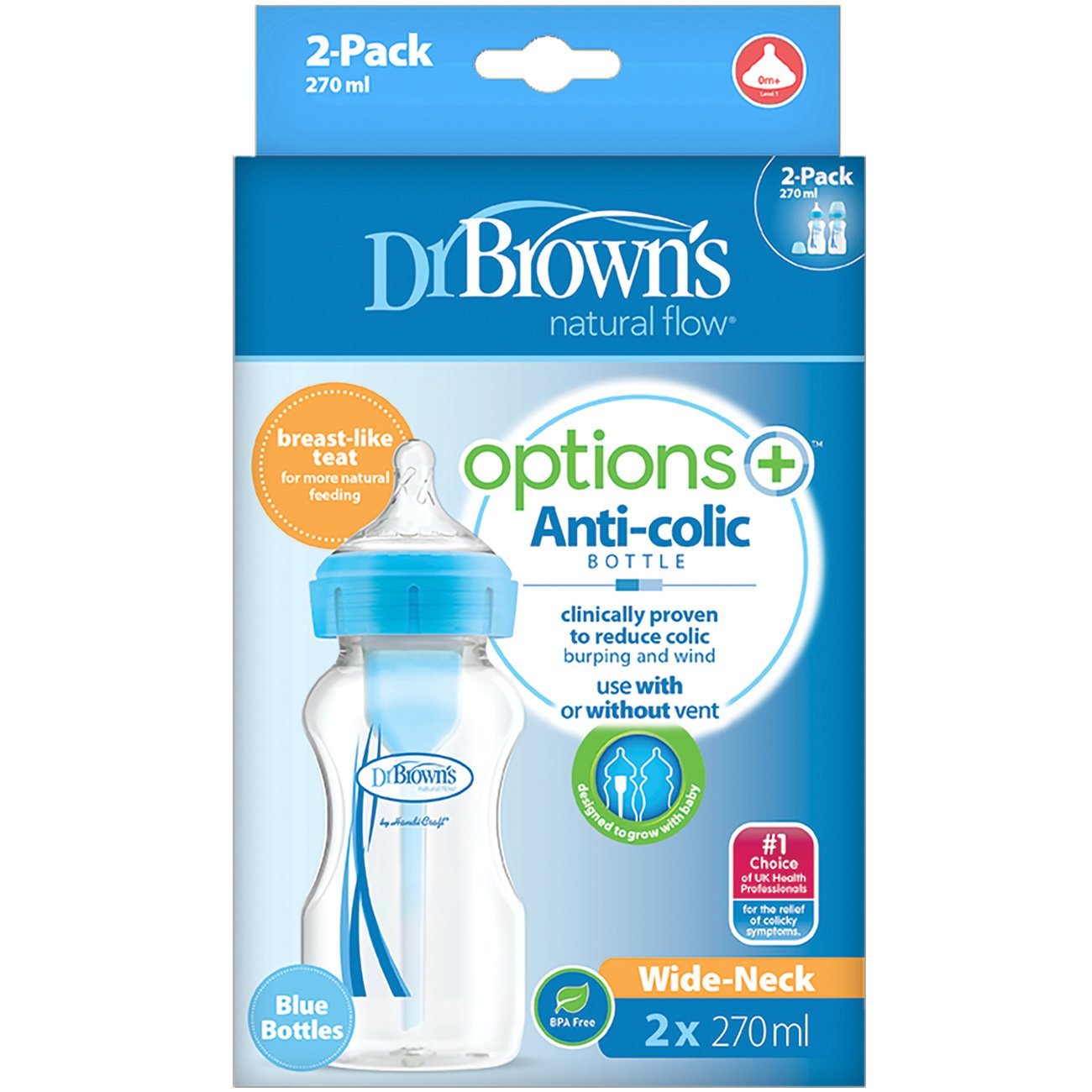 Dr. Brown’s Promo Natural Flow Options+ Anti-Colic Wide Neck Blue Bottle 0+m Πλαστικό Μπιμπερό με Φαρδύ Λαιμό σε Μπλε Χρώμα, Κατάλληλο από την Γέννηση 2x270ml