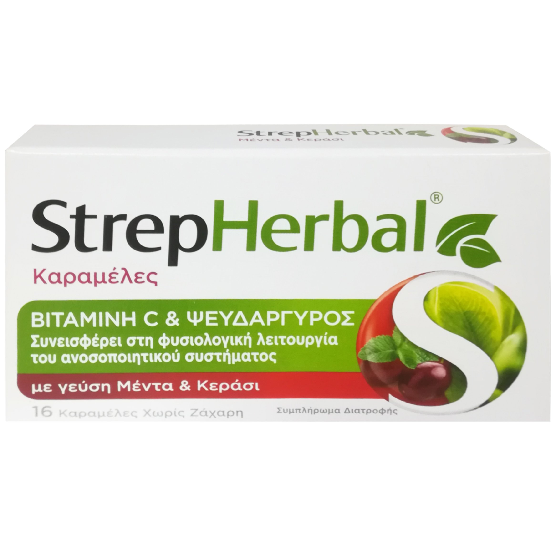 StrepHerbal Καραμέλες Βιταμίνη C & Ψευδάργυρος για την Φυσιολογική Λειτουργία του Ανοσοποιητικού Συστήματος 16 Τεμάχια - Κεράσι & Μέντα