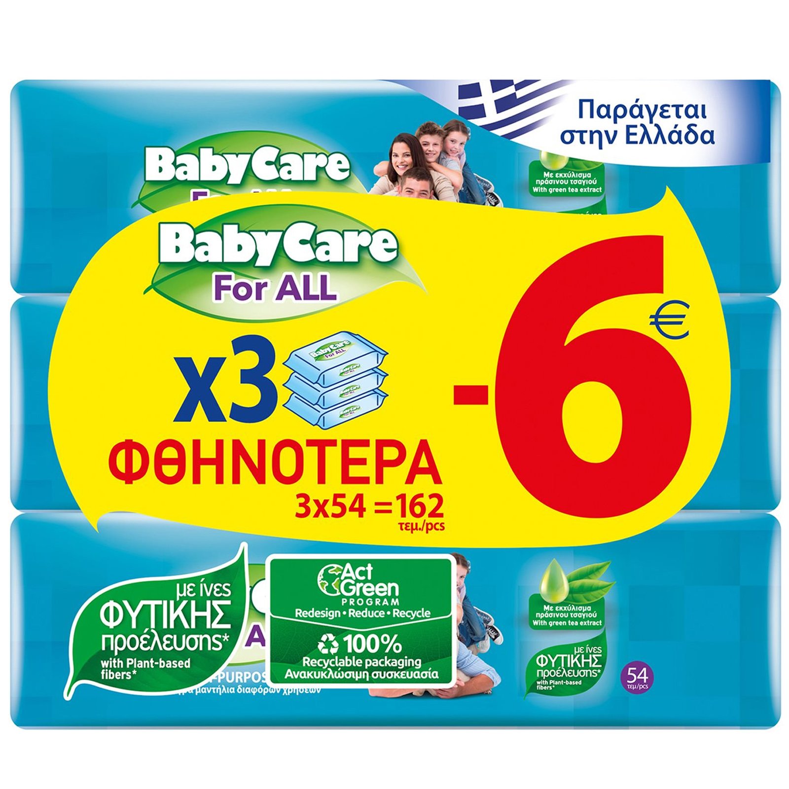 BabyCare 0% Perfume Baby Wipes Μωρομάντηλα με Καπάκι Χωρίς Άρωμα με Οργανικό Εκχύλισμα Χαμομηλιού 2+1 Δώρο, 162 Τεμάχια (3x54 Τε